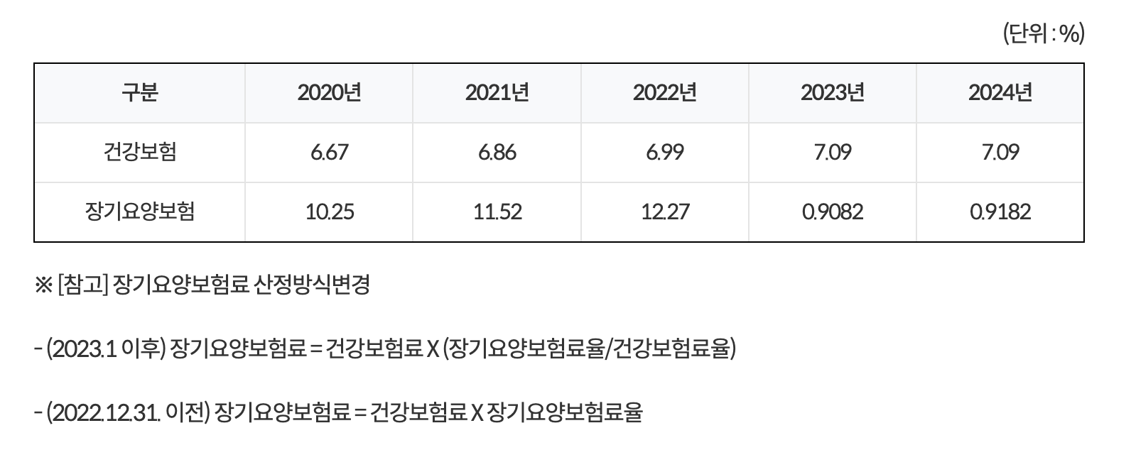 2016년부터 2025년 까지 보험료율을 연도별로 나타낸 표입니다. 건강보험료율과 장기요양보험료율을 한눈에 보실 수 있죠. 그리고 비고란도 확인해 보시면 장기요양보험료 산정방식 변경이 되었다는 내용도 역시나 다시 확인하실 수 있습니다.