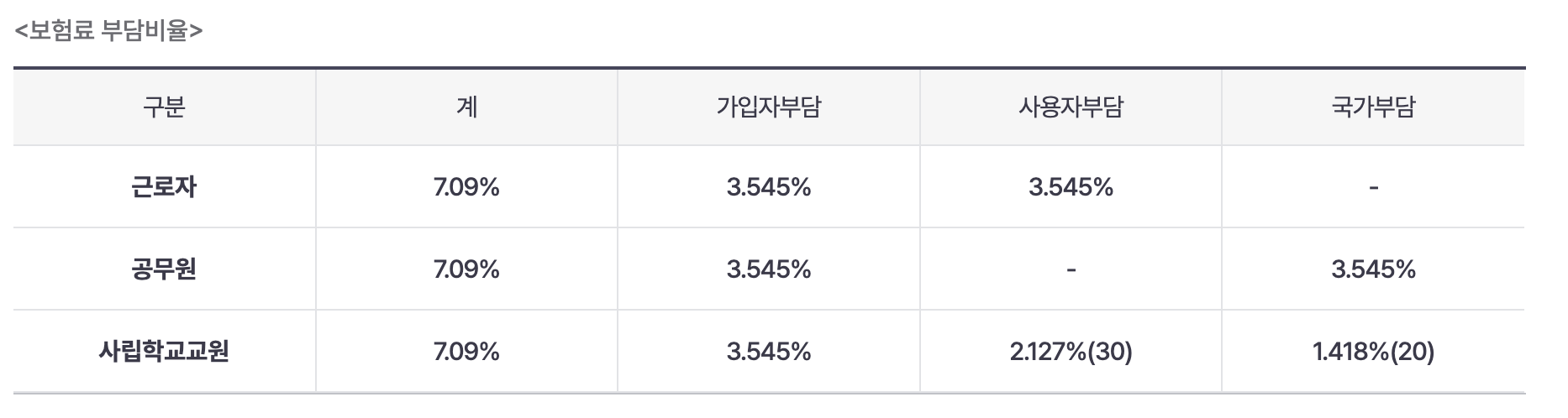 참고로, 2025년 근로자, 공무원, 사립학교교원으로 구분하여 보험료 부담을 보여주는 표입니다. 가입자부담은 동일하지만 사용자부담과 국가부담이 달라지는 것을 확인할 수 있지요.