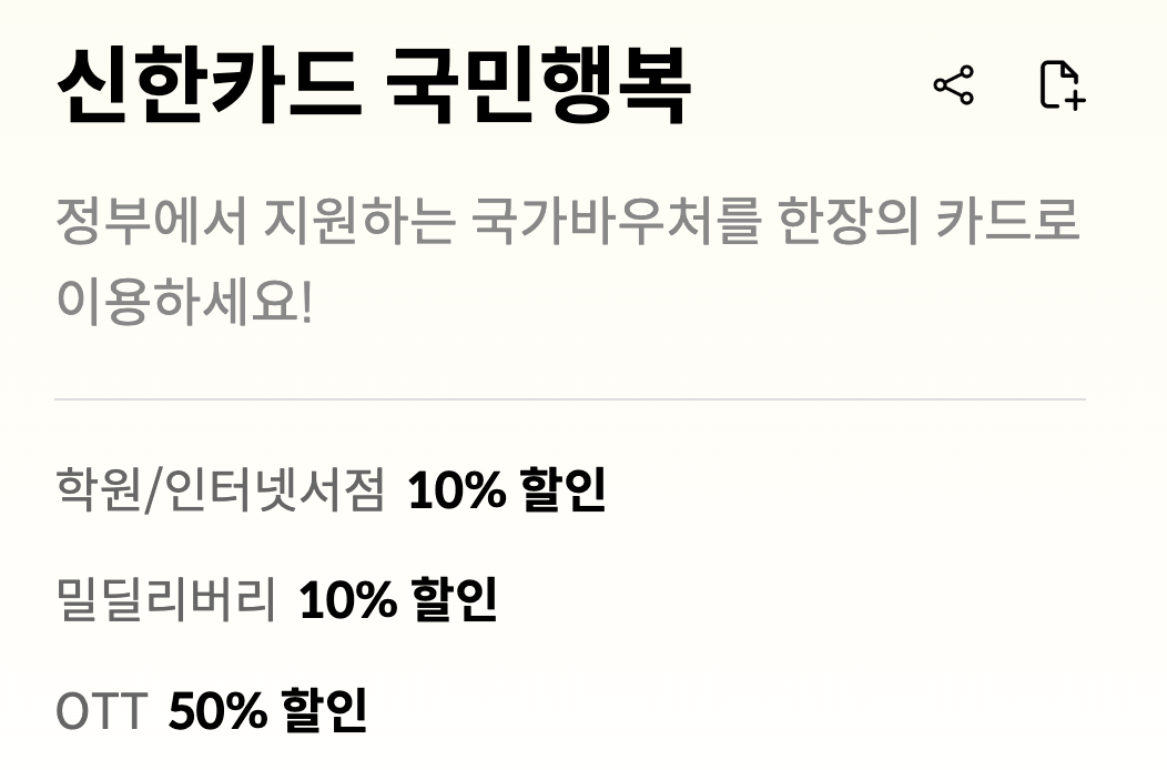- 신한 국민행복카드는 문화생활까지 챙기고 싶은 맘을 위해 추천드리고요.