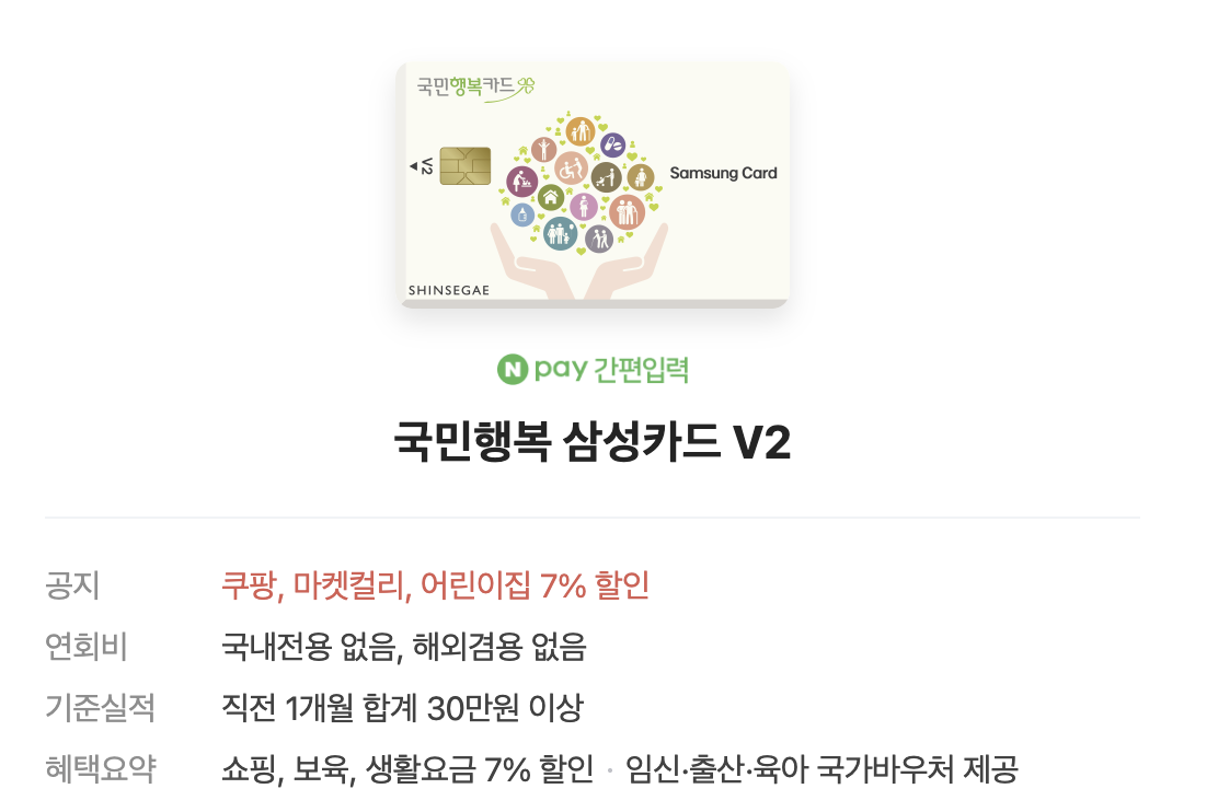 신한카드 국민행복카드의 경우는 육아맘에게 인기가 좋은 편입니다.