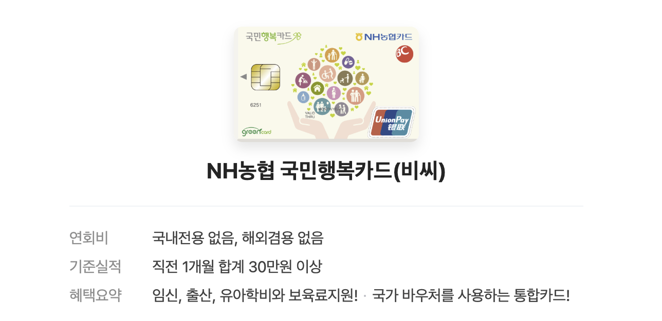 NH농협카드 국민행복카드 비씨는 건강보험 임신, 출산 진료비 지원부터 지역에 강점을 가지고 있습니다.