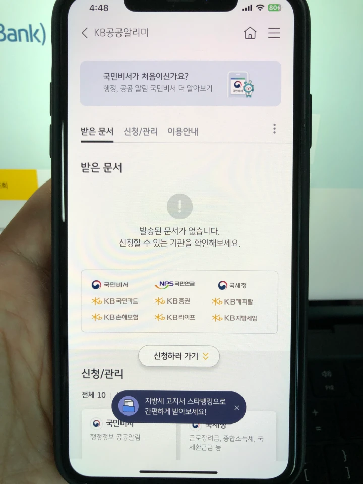 KB국민지갑 홈화면에서 하단 '국민비서 전자문서'를 누르면 KB공공알리미라고 해서 받은 문서, 신청/관리 그리고 이용안내 메뉴가 제공됩니다.