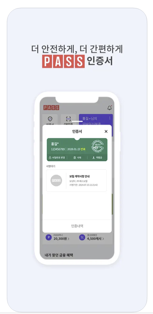 • 간편 본인 인증: 6자리 PIN 번호나 생체인식(지문, 얼굴, FaceID 등)으로 빠른 인증이 가능합니다.