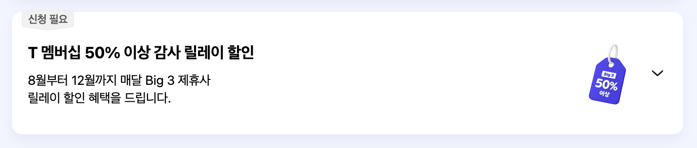 신청이 필요한 혜택은 "T 멤버십 50% 이상 감사 릴레이 할인"입니다.