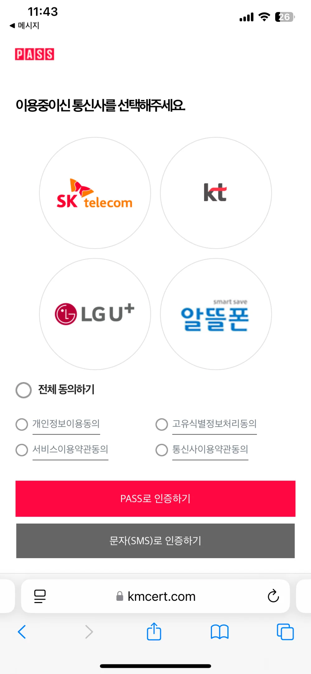 사용하시는 이통사를 선택하시고 "전체 동의하기"누르고 인증을 시도해 주세요.