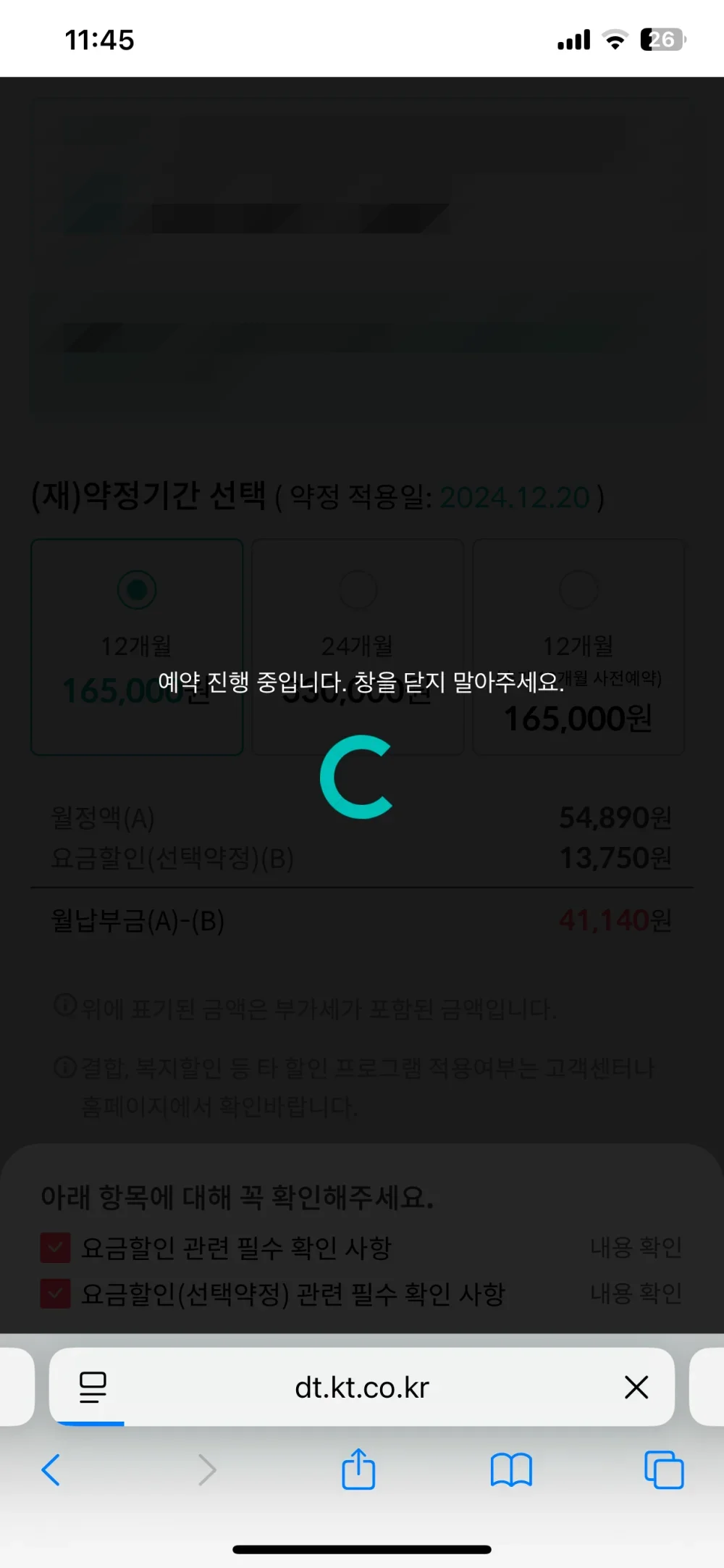확인을 하셨다면 원하시는 약정 개월수를 선택하시고 하단에 "요금할인(선택약정) 예약하기"를 눌러 주세요. 그리고 추가 동의하실 내용은 체크 후 진행하시면 됩니다.