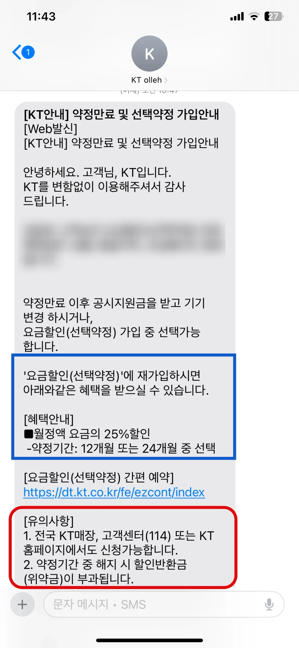 말씀드린 것처럼 보통은 아래와 같이 KT 안내로 약정 만료 및 선택약정 가입 안내라는 제목으로 문자가 띡 오는데요. 내용을 확인해 보면 재약정 시 월정액의 25% 할인 혜택과 더불어 선택약정 요금할인 간편 예약할 수 있는 링크가 옵니다.
