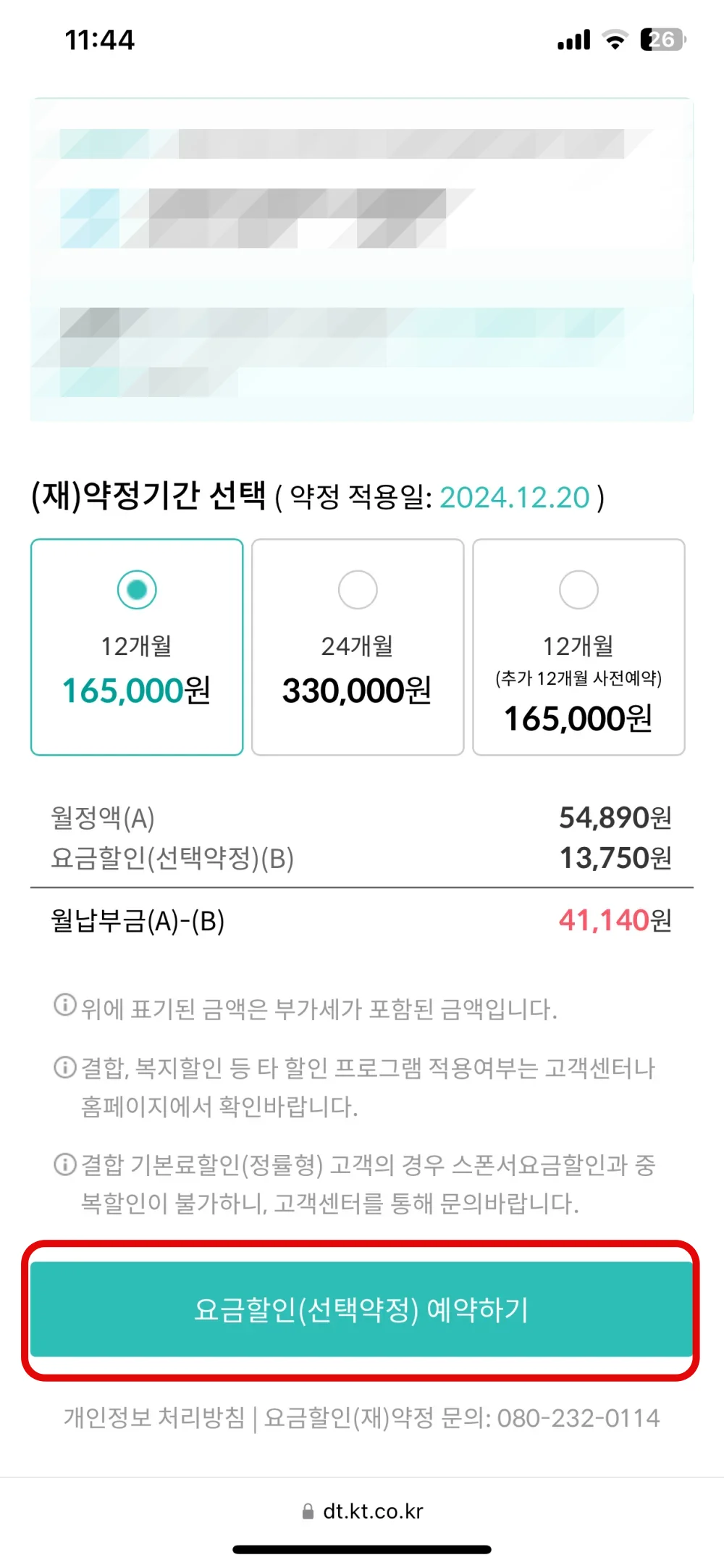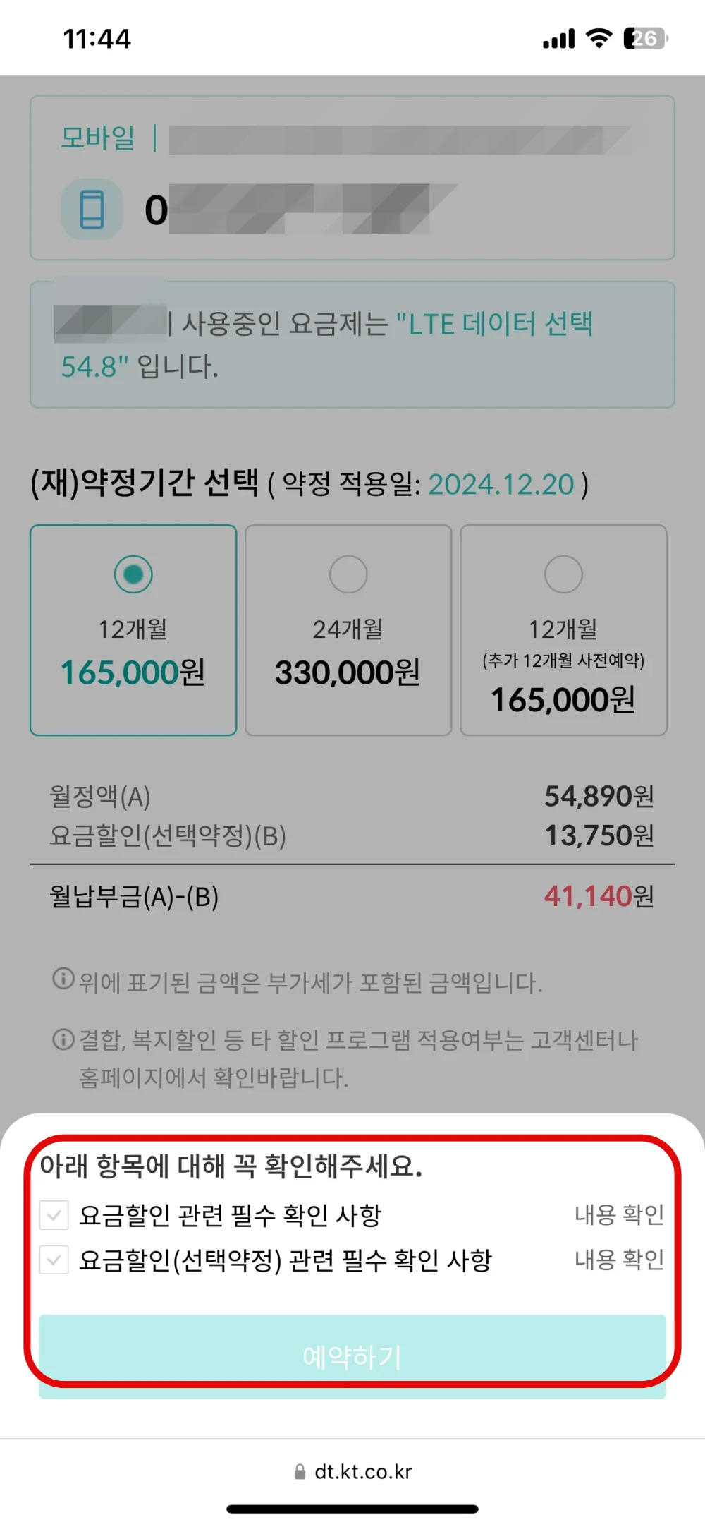 확인을 하셨다면 원하시는 약정 개월수를 선택하시고 하단에 "요금할인(선택약정) 예약하기"를 눌러 주세요. 그리고 추가 동의하실 내용은 체크 후 진행하시면 됩니다.
